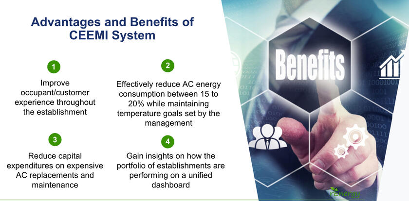 Renergy CEEMI solution reduces costs and usage of your air conditioning intelligently.Customers feel more comfort, they stay longer, purchase more and your business saves on energy costs. Win-Win!